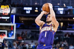 上半场布克出战15分21秒,投篮11中7,三分1中0,罚球5中5,砍下19分2篮板4助攻。